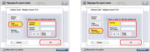 Pour spécifier une plage d'adresses IPv4 : Appuyer sur [Plage d'adresses] → appuyer sur [Première adresse] → saisir la première adresse IPv4 → appuyer sur [Dernière adresse] → définir la dernière adresse IPv4.