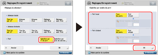 Appuyer sur [Spécifier par n° de port] pour <Port> → spécifier <Port local> et <Port distant> → appuyer sur [OK].