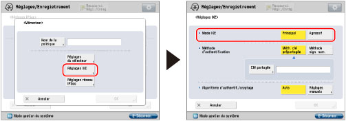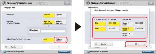 Appuyer sur [Réglages manuels] pour <Algorithme d'authentif./cryptage> → définir l'algorithme de la méthode d'authentification → appuyer sur [OK].