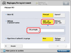 Appuyer sur [Méth. clé prépartagée] pour <Méthode d'authentification> → [Clé partagée].