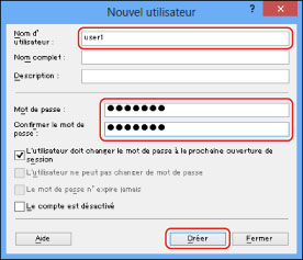 Dans la boîte de dialogue [Nouvel utilisateur], saisir le nom d'utilisateur dans [Nom d'utilisateur] → saisir le mot de passe dans [Mot de passe] → saisir à nouveau le mot de passe dans [Confirmer le mot de passe] → cliquer sur [Créer].