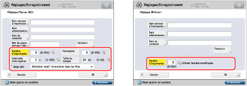 "Réglages du service d'impression NetWare". (Les réglages varient suivant le service d'impression. Pour les réglages du service d'impression, voir <Service d'impression> dans