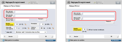 Dans [Nom du serv. de fichiers], saisir le nom du serveur de fichiers auquel le serveur d'impression souhaité appartient → dans [Nom serveur d'impression], saisir le nom du serveur d'impression souhaité.