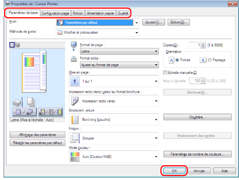 Définir les réglages souhaités dans l'écran de configuration d'imprimante →cliquer sur [OK].