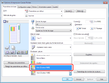 Lorsque l'option [Auto [Couleur/N&B]] est activée, la machine sélectionne automatiquement le mode couleur ou le mode noir et blanc en fonction du type de document.