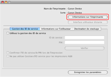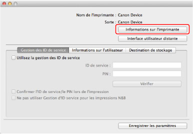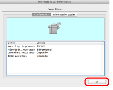 Si le nom du pilote d'imprimante indiqué en haut de la boîte de dialogue Informations sur l'imprimante] et celui présenté comme [Nom récupéré de l'imprimante] ne correspondent pas, il se peut que les fonctions de l'imprimante ne donnent pas les résultats attendus. Si les noms sont différents, supprimer l'imprimante qui a été ajoutée dans [Préférences Système], puis l'ajouter de nouveau. Pour plus d'informations, voir le Guide du pilote d'imprimante (voir " Installation").