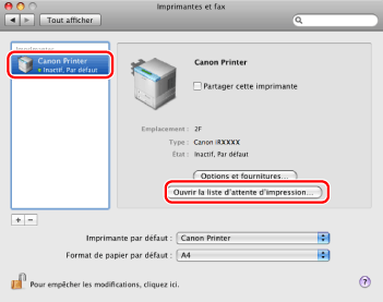 Sélectionner l'imprimante → cliquer sur [Ouvrir la liste d'attente d'impression].