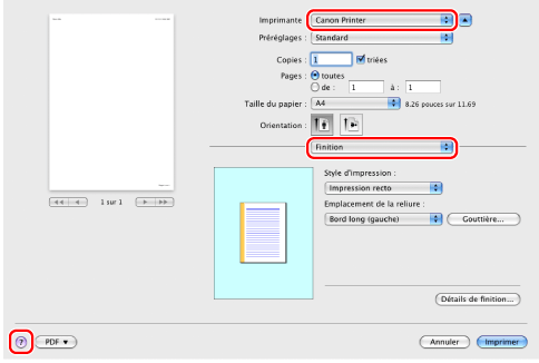 Sélectionner l'imprimante dans [Imprimante] → sélectionner l'un des panneaux de préférences → cliquer sur [