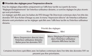 Lorsqu'il est possible de définir indifféremment une fonction de menu en utilisant les touches de la machine ou en définissant les réglages dans l'application ou le pilote d'imprimante, c'est le réglage défini dans l'application ou le pilote d'imprimante qui est prioritaire.