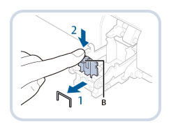 Après avoir éliminer le bourrage d'agrafes, veiller à remettre manuellement les agrafes en place dans l'agrafeuse avec piqûre à cheval. (Voir "Repositionnement des agrafes pour le mode piqûre à cheval".)