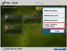Seul l'administrateur système, l'administrateur système SSO-H (Administrator), l'administrateur réseau Network Administrator (NetworkAdmin) ou l'administrateur de périphériques (DeviceAdmin) est autorisé à modifier la configuration des réglages de restriction d'accès au menu rapide. Pour plus d'informations sur les types d'administrateur, voir "Réglages administrateur".