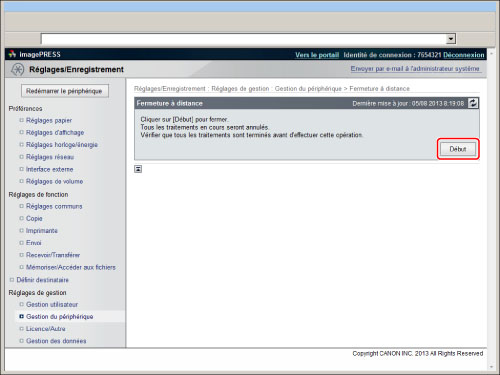 Il est possible d'arrêter la machine à partir de l'interface utilisateur distante à l'aide du mode de fermeture à distance.