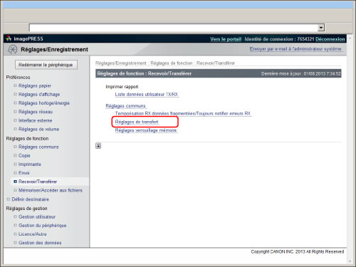 Il est également possible de spécifier les réglages de transfert depuis le panneau de commande de la machine en appuyant sur [Réglages de fonction] (Réglages/Enregistrement) → [Recevoir/Transférer] → [Réglages communs] → [Réglages de transfert]. Pour plus d'informations sur l'utilisation du panneau de commande pour définir les réglages de transfert et sur les réglages proprement dits, voir "Recevoir/Transférer".