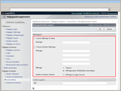 Si [Affichage sur page d'accueil] est sélectionné, la messagerie s'affiche sur la page de portail de l'interface utilisateur distante.