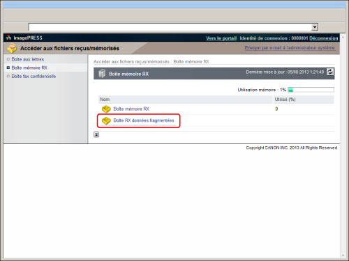 Cliquer sur [Accéder aux fichiers reçus/mémorisés] → [Boîte mémoire RX] → [Boîte RX données fragmentées].
