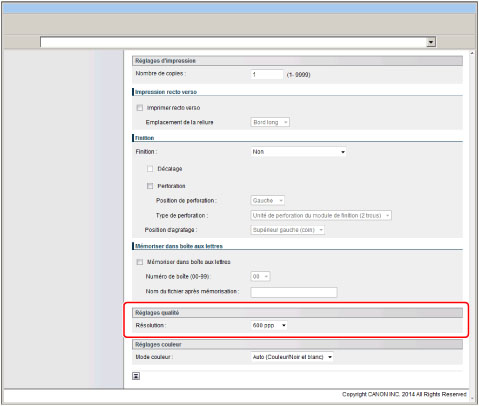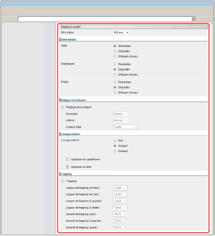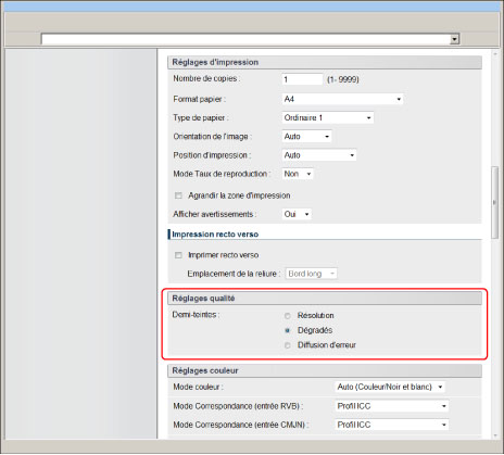 Si [Résolution] est sélectionné, le texte peut s'imprimer avec des contours distincts, option qui convient le mieux à l'impression de texte et de lignes fines.