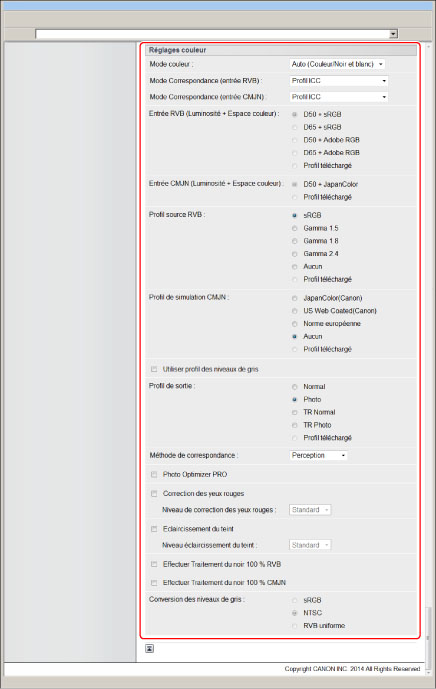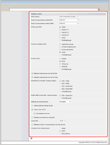 Ce réglage utilise la cible de simulation personnalisée téléchargée de l'ordinateur hôte sur cette machine avec iW Management Console. Tous les profils disponibles peuvent ne pas être utilisables. Si les données en couleur s'impriment en niveaux de gris avec un profil téléchargé, vérifier le profil téléchargé pour compatibilité.