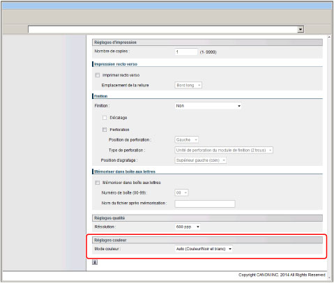 Si [Auto (Couleur/Noir et blanc)] est sélectionné, la machine détecte automatiquement si la page est reproduite en noir (N) uniquement ou avec quatre couleurs : cyan (C), magenta (M), jaune (J) et noir (N).