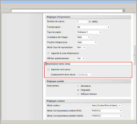 Ce réglage spécifie s'il faut imprimer au recto ou au recto verso du papier.