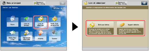 Pour lire l'original et le mémoriser, appuyer sur la touche [Lire et mémoriser] de l'écran du menu principal → spécifier l'emplacement où les données lues doivent être mémorisées.