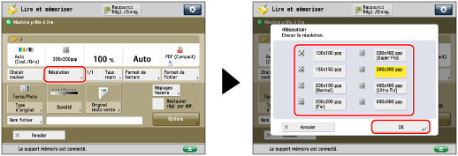 En cas de mémorisation de fichiers dans une boîte aux lettres, la résolution est fixée à 600 ppp.
