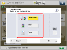 Si le support mémoire est sélectionné comme emplacement de stockage, sélectionner [Texte/Photo] → appuyer sur [Régler niveau] → sélectionner [Priorité Texte] ou [Priorité Photo] → appuyer sur [OK] pour régler le niveau de priorité associé au traitement du texte/de la photo.
