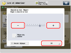 Si la densité de fond est réglée en appuyant sur [Régler] pour <Densité du fond>, le réglage [Auto] est annulé. De même, si l'on appuie sur [Auto] pendant les réglages manuels sous [Régler], les réglages sont annulés. La machine règle automatiquement la densité en fonction du fond.