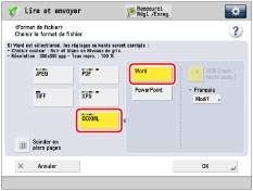 Si le format de fichier sélectionné est PDF ou XPS, il est possible de régler simultanément [Compact] et [OCR (rech. texte poss.)]. Dans ce cas, le format de fichier [PDF (Compact)] ou [XPS (Compact)] s'affiche dans l'écran des fonctions de base des modes lecture et envoi.
