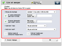 Si les réglages du mode PDF crypté sont rappelés en appuyant sur [Réglages préc.], le mot de passe n'est pas rappelé et les champs [M.passe ouvert. doc.] et [Mot passe autorisation] sont vierges.