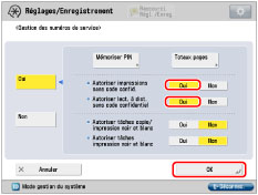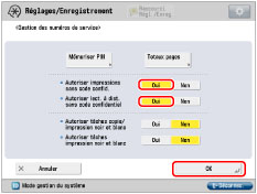 Les paramètres <Autoriser impressions sans code confid.> et <Autoriser lect. à dist. sans code confidentiel> ne sont activés que si la machine propose les fonctions d'impression et de lecture à distance.