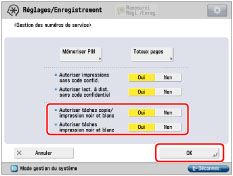 Si <Autoriser impressions sans code confid.> est réglé sur "Oui", toutes les tâches d'impression sont acceptées. De ce fait, le réglage Autoriser tâches imprimante noire est ignoré.