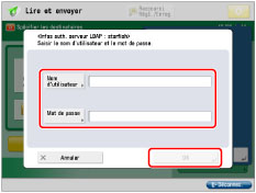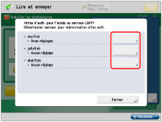 Utilise les informations d'authentification définies sous [Mémoriser serveur LDAP]. (Voir "Mémorisation d'un serveur LDAP".) D'autres réglages ne sont pas requis pour chaque utilisateur.