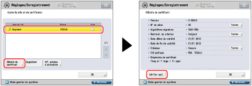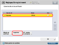 Les biclés pour lesquelles "Utilisé" s'affiche dans <Statut> ne peuvent pas être supprimées parce qu'elles sont utilisées avec l'authentification IEEE802.1X/IPSec ou que SSL est activé. Appuyer sur [Aff. emplac. d'utilisation] pour vérifier le type de sécurité pour lequel la biclé est utilisée. Pour supprimer une biclé uniquement utilisée avec SSL, désactiver les réglages suivants. Une biclé en cours d'utilisation pour l'authentification IEEE802.1X/IPSec ne peut pas être supprimée.
