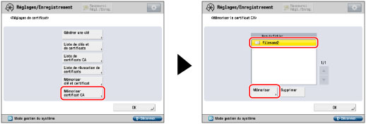 Appuyer sur [Mémoriser certificat CA] → sélectionner un nom de fichier → appuyer sur [Mémoriser].