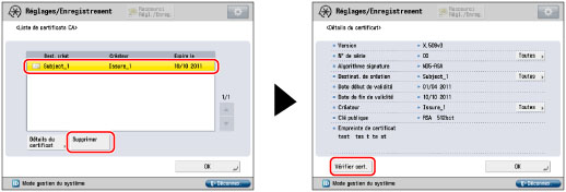 Il est possible de confirmer les réglages des certificats CA enregistrés. Il est également possible de supprimer les certificats CA inutiles.