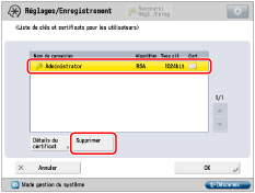 Pour plus d'informations sur la manière dont un simple utilisateur peut afficher le certificat utilisateur, voir "Vérification d'une signature de périphérique/d'un certificat de signature utilisateur". Toutefois, dans ce cas, seul le certificat de l'utilisateur actuellement connecté apparaît. Les certificats des autres utilisateurs ne peuvent pas être affichés. Le certificat de l'utilisateur ne peut pas non plus être supprimé dans cet écran. Un utilisateur doit utiliser l'interface utilisateur distante pour supprimer son certificat. (Voir "Installation d'un fichier de certificat".)