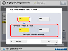 Appuyer sur [Tjrs ajouter signature périph. pour envoi] → [Oui] pour <Tjrs ajouter signature périph. pour envoi> → spécifier le réglage de <Restriction formats de fichier>.