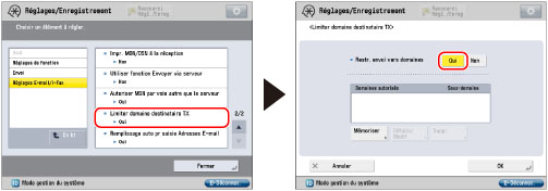Appuyer sur [Limiter domaine destinataire TX] → [Oui] pour <Restr. envoi vers domaines>.