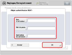 Appuyer sur [Définir Authentification MEAP] sous <Réglages de transmission> → spécifier les réglages suivants → appuyer sur [OK].