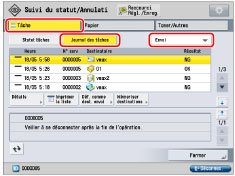 → [Tâche] → [Journal des tâches] → [Envoi]. Si le document a été correctement reçu, [OK] s'affiche ; dans le cas contraire, [NG] s'affiche. Si les résultats ne peuvent être confirmés, [--] s'affiche. En mode Simple, la confirmation de la distribution est désactivée. Même si la distribution s'est correctement passée, [--] s'affiche.![]() |