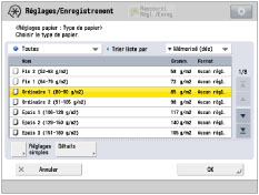 Il est possible de mémoriser les types de papier chargés ne figurant pas sur la liste des réglages détaillés. Pour plus d'informations sur la mémorisation des types de papier, voir "Présentation de cette fonction".