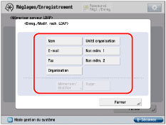Seuls les deux attributs de recherche affichés par défaut comme "Non mémorisé" peuvent être modifiés. Il est impossible de modifier les attributs de nom, d'e-mail, de télécopie, d'organisation et d'unité d'organisation.