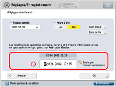 Il est possible également de synchroniser automatiquement la date et l'heure sur celles d'un serveur du réseau avec le protocole SNTP dans l'écran Réglages/Enregistrement. (Voir "Réglages communs à TCP/IPv4 et TCP/IPv6".)