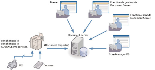Vous pouvez stocker des documents créés à l'aide de iW Desktop ainsi que des documents numérisés par le biais du réseau à l'aide d'une machine Canon et de la série Document Scanner DR (scanner de document), et développer un système de gestion de documents avancé afin de gérer efficacement des documents stockés.