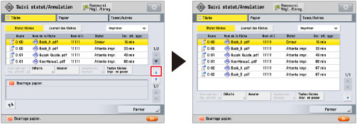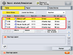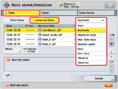 Si [Délai tâche en suspens] sous [Réglages de fonction] (Réglages/Enregistrement) est défini sur "Oui", la tâche suspendue en raison de l'indisponibilité du papier d'impression s'affiche en tant que tâche suspendue au terme d'un délai spécifié. Pour reprendre l'impression de la tâche suspendue, charger le papier → sélectionner la tâche → appuyer sur [Détails] → [Reprise].