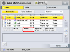 Si le type de tâche [Impression] ou [Copie] est sélectionné, on peut définir [Imprimer entièrement la copie en cours]. Ce bouton annule la tâche de copie/impression sélectionnée après le jeu d'une copie/impression en cours.