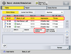 Dès que l'impression de l'épreuve est terminée, la machine reprend automatiquement la tâche. Si les réglages doivent être modifiés, appuyer sur [Annuler] ou [Toutes tâches impr. en pause] puis apporter les modifications nécessaires.