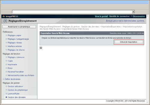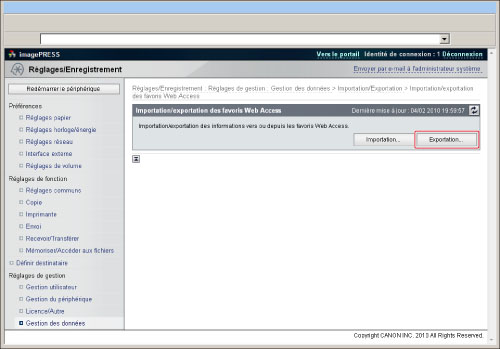 Cliquer sur [Favoris Web Access] pour <Importation/Exportation individuelle> → [Exportation...].