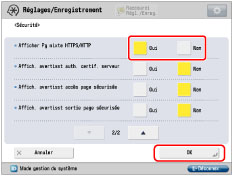 Appuyer sur [Sécurité] → sélectionner [Oui] pour <Afficher Pg mixte HTTPS/HTTP> → appuyer sur [OK].