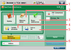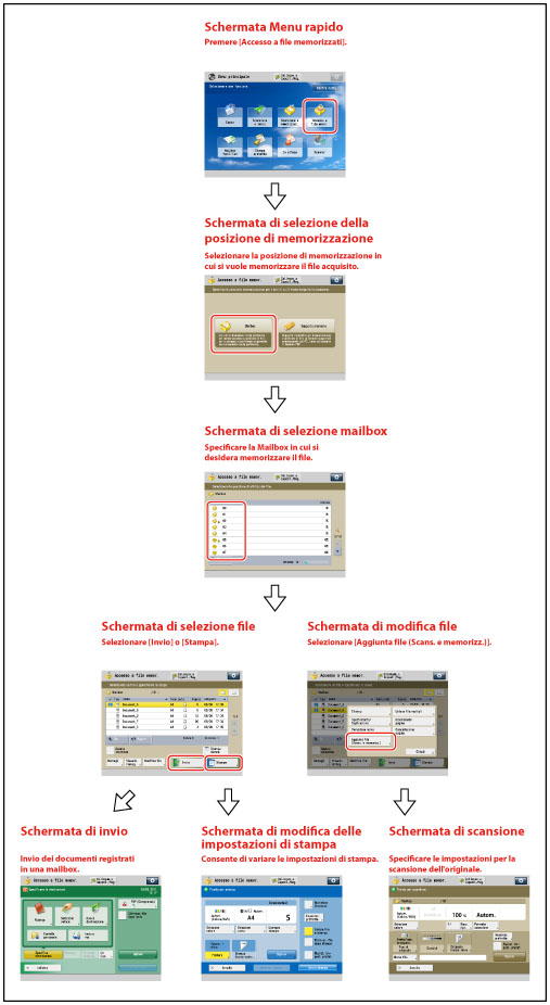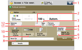 Per la procedura di [Aggiunta file (Scans. e memorizz.)] e le istruzioni sull'utilizzo della schermata di scansione, vedere "Aggiunta di un file (Scansione e memorizzazione)" e "Flusso delle operazioni di scansione e memorizzazione".